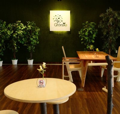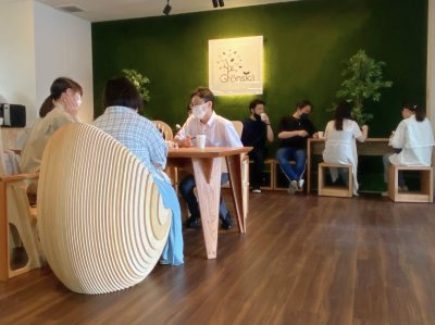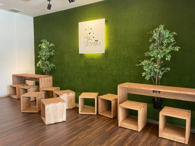 この場所を基点として屋外の緑と施設内がつながるようにとの思いを込め、スウェーデン語で「緑」を表す【グランスカ】と名付けました。このロゴは「左側を過去、右側を未来」ととらえ、「左側に育った木、右側に新しい芽吹き」を描くことで、今までの八幡を大切にしつつ、今後も新しいことに挑戦していきたいという思いを表現したものです。