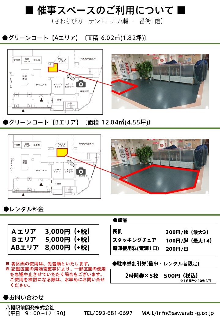 催事スケジュール さわらびガーデンモール八幡一番街・催事スケジュール ※催事は主に、「一番街1階の催事スペース」にて実施します。 ※上記スケジュールは、予告なく変更する場合がございます。 催事に関するお問合せは、八幡駅前開発株式会社(TEL:093-681-0697)まで。